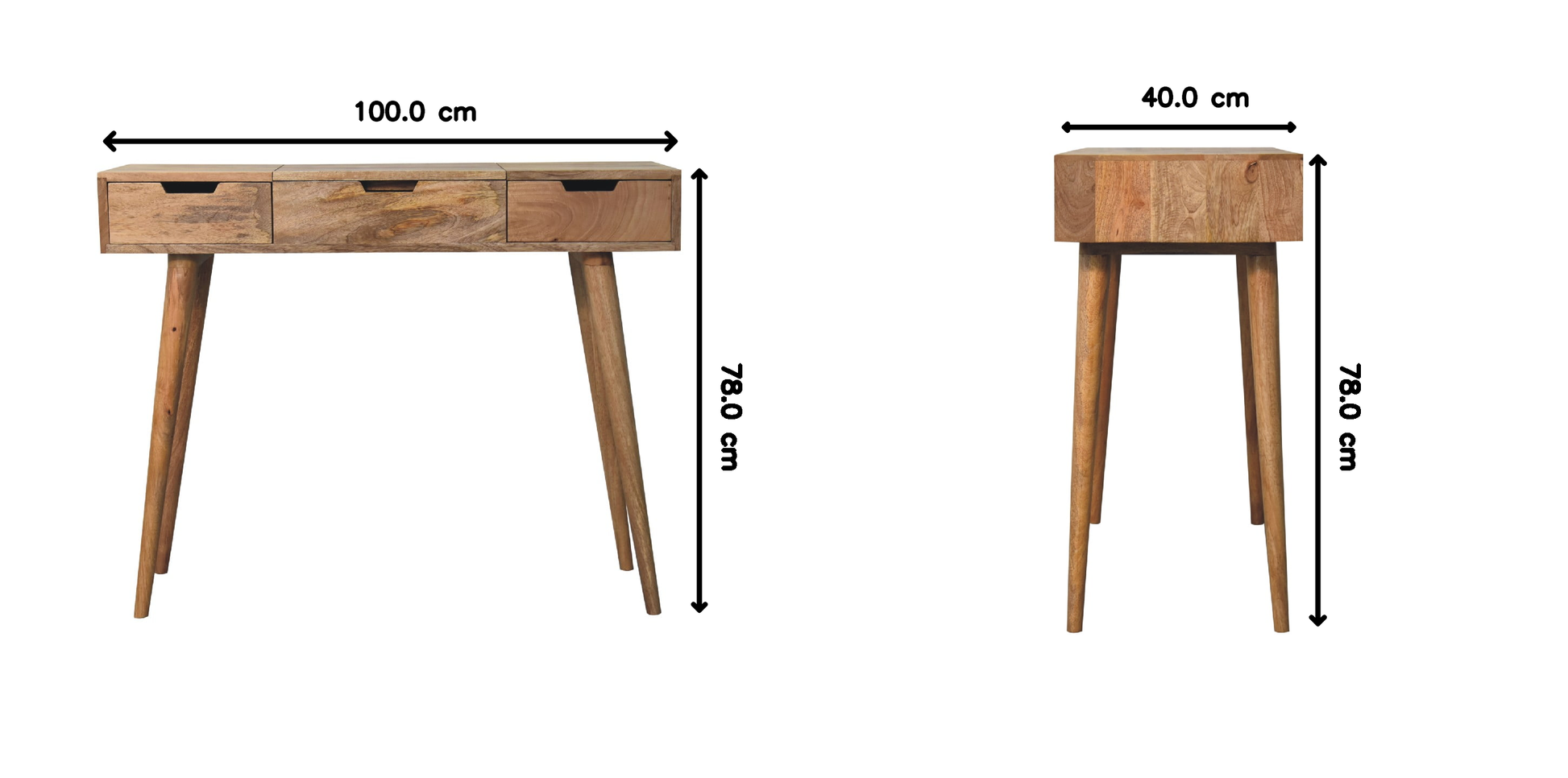 Made from 100% solid mango wood in a warm oak finish, this piece features three spacious drawers, a foldable mirror, and hidden storage compartments to keep your essentials organised. Its clean lines and Nordic-style legs create a modern, minimal look while maintaining a natural, premium feel.